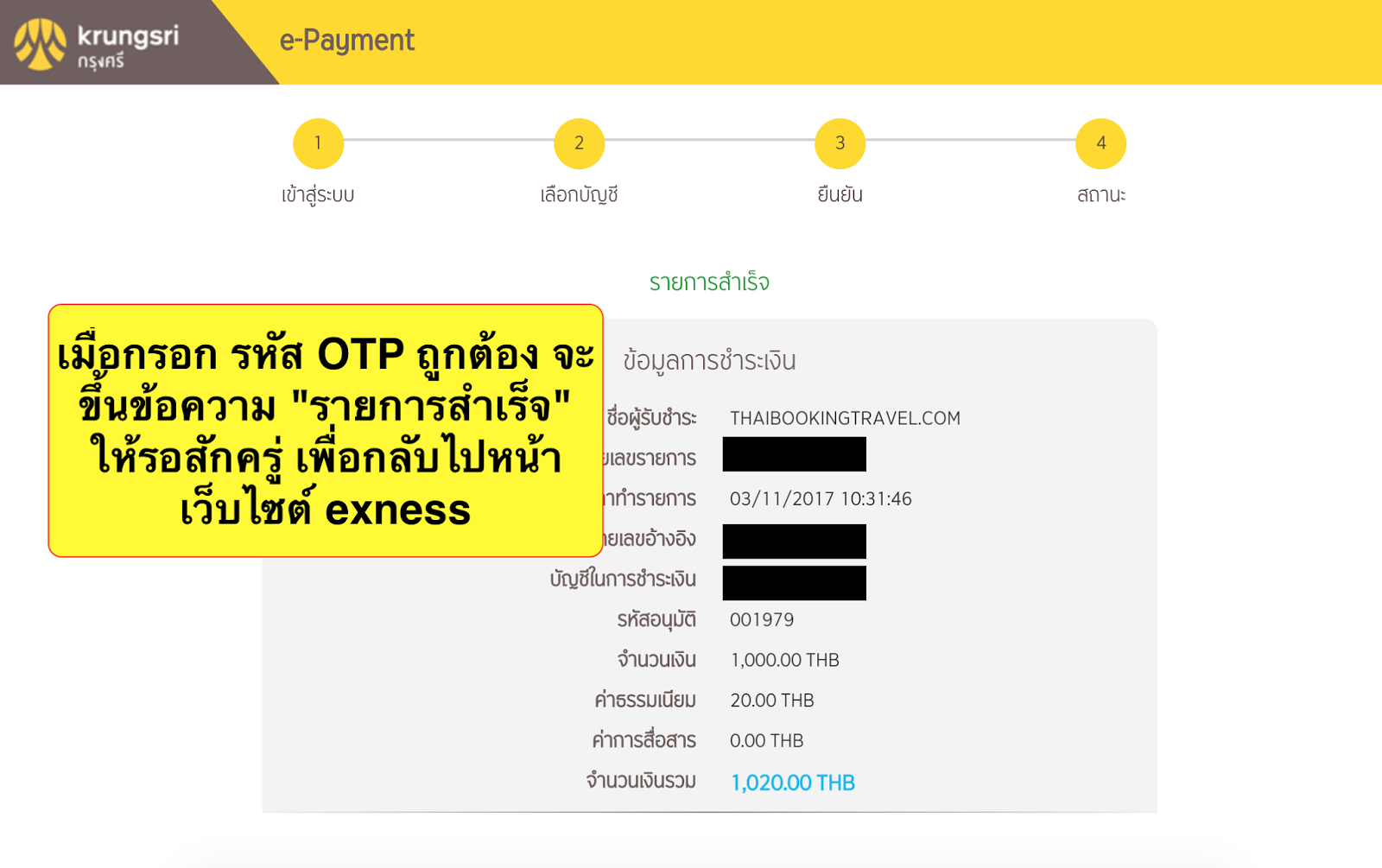 เมื่อกรอกรหัส OTP ถูกต้อง ธนาคารจะโอนเงินจากบัญชีกรุงศรีไปที่บัญชีเทรดของเรา และขึ้นข้อความว่า “รายการสำเร็จ” ให้รอสักครู่ เพื่อกลับไปหน้าเว็บไซต์ exness