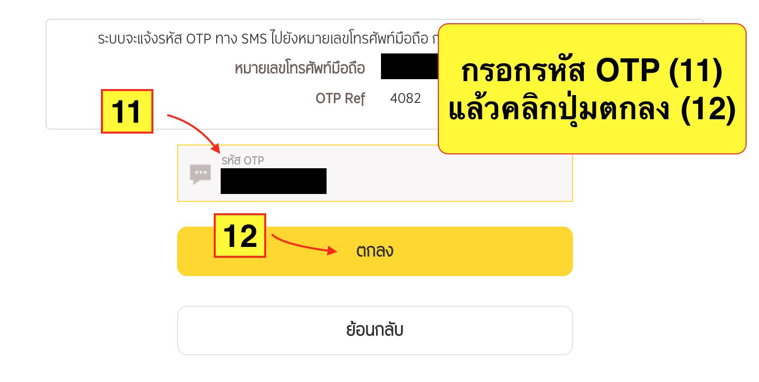 11) ให้นำรหัส OTP ที่ได้ มากรอกในช่อง รหัส OTP