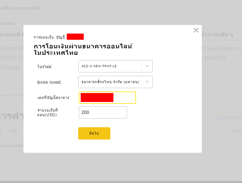 - ใส่จำนวนเงิน สุกลเป็น USD ในตัวอย่าง ผมถอนออกมา 200