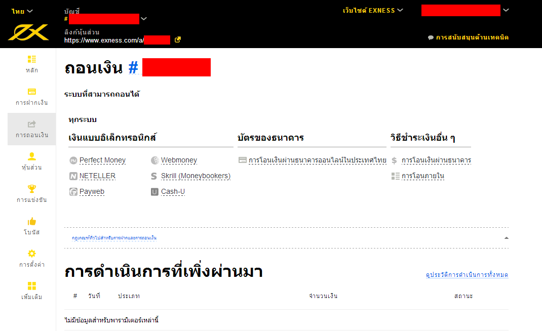 คลิกที่เมนู การถอนเงิน > การโอนเงินผ่านธนาคารออนไลน์ในประเทศไทย